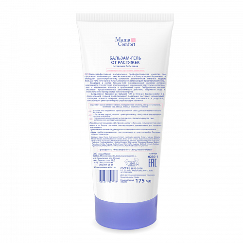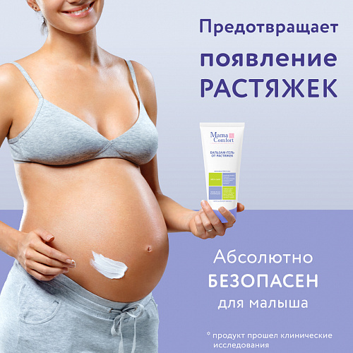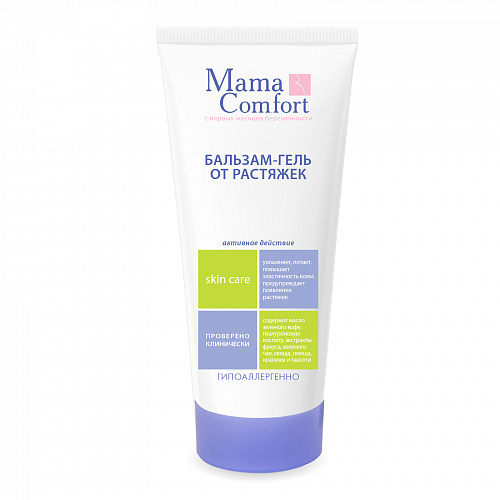 Бальзам-гель от растяжек серии "Mama Com.fort" высокоэффективное натуральное профилактическое средство предупреждает появление растяжек на коже живота и бедер в период беременности. Благодаря сбалансированному сочетание биологических активных веществ бальзам-гель интенсивно питает, увлажняет, регенерирует и разглаживает кожу. Входящий в состав бальзам-геля инновационный комплекс активных компонентов способствует восстановлению нарушенной структуры коллагеновых и эластиновых волокон в проблемных зонах. Гиалуроновая кислота оказывает продолжительное увлажняющее действие, удерживая воду в межклеточном пространстве кожного покрова. Ежедневное применение бальзам-геля в течении беременности и в послеродовой период предупреждает появление растяжек, нормализует состояние кожного покрова, возвращая ему эластичность и упругость, способствует уменьшению уже существующих растяжек. Бальзам-гель от растяжек содержит масло зеленого кофе, гиалуроновую кислоту, экстракты фукуса, зеленого чая, хвоща, плюща, крапивы и таволги. Бальзам-гель от растяжек протестирован дерматологами и проверен клинически.