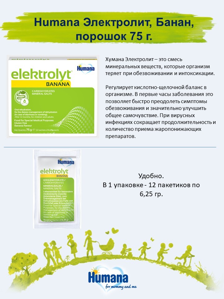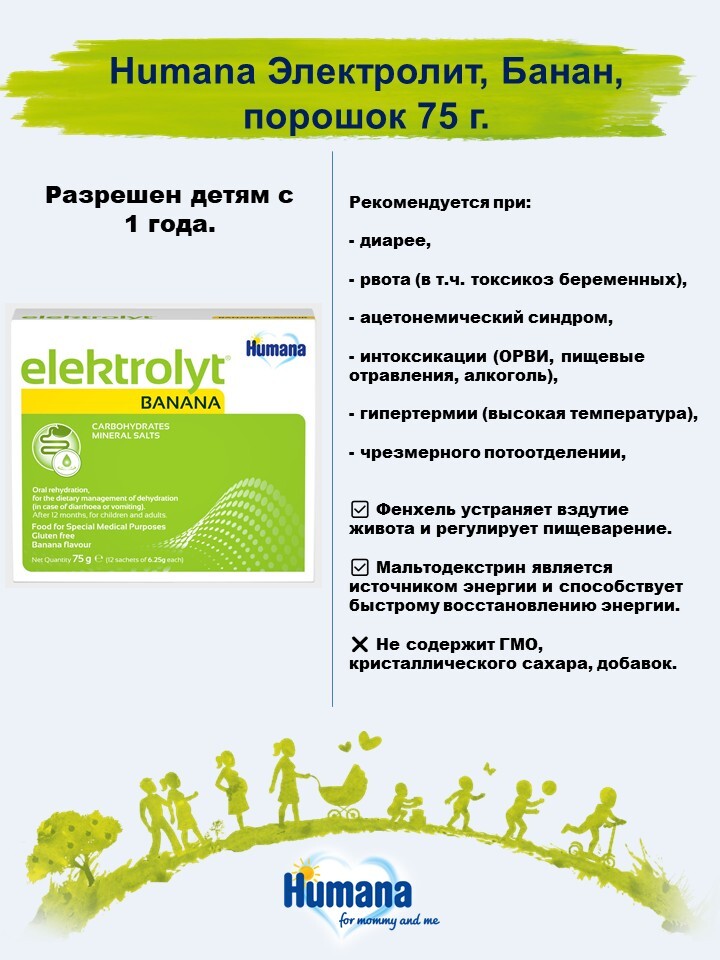 Humana Электролит рекомендуется в любом возрасте при диарее, рвоте, ацетонемическом синдроме, интоксикациях.