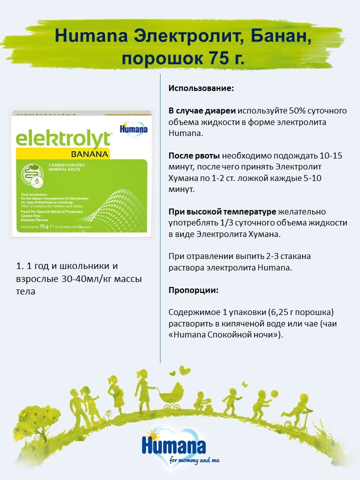 Начинать употребление Humana Электролит рекомендуется при появлении первых признаков заболевания.