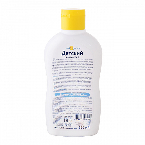Хорошая переносимость детского шампуня 2 в 1 серии "Мой утенок" подтверждена клиническими испытаниями в аккредитованных лабораториях. Шампунь может быть использован в детской педиатрической практике для гигиенических процедур у детей в лечебно-профилактических учреждениях: родильных домах, перинатальных центрах, отделениях неонатологии, акушерских стационарах и быту.