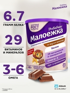 PediaSure Малоежка со вкусом шоколада - это вкусный питательный напиток, который дополнит несбалансированную еду питательными веществами, чтобы ребёнок получал всё самое необходимое для здорового роста, развития и укрепления иммунитета.