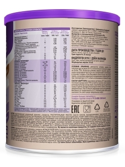 Состав: гидролизованный кукурузный крахмал, сахароза, растительные масла (масло канола, высокоолеиновое подсолнечное масло, подсолнечное масло, среднецепочечные триглицериды), концентрат молочного белка, мальтодекстрин, изолят соевого белка, какао-порошок, фруктоолигосахариды (ФОС),