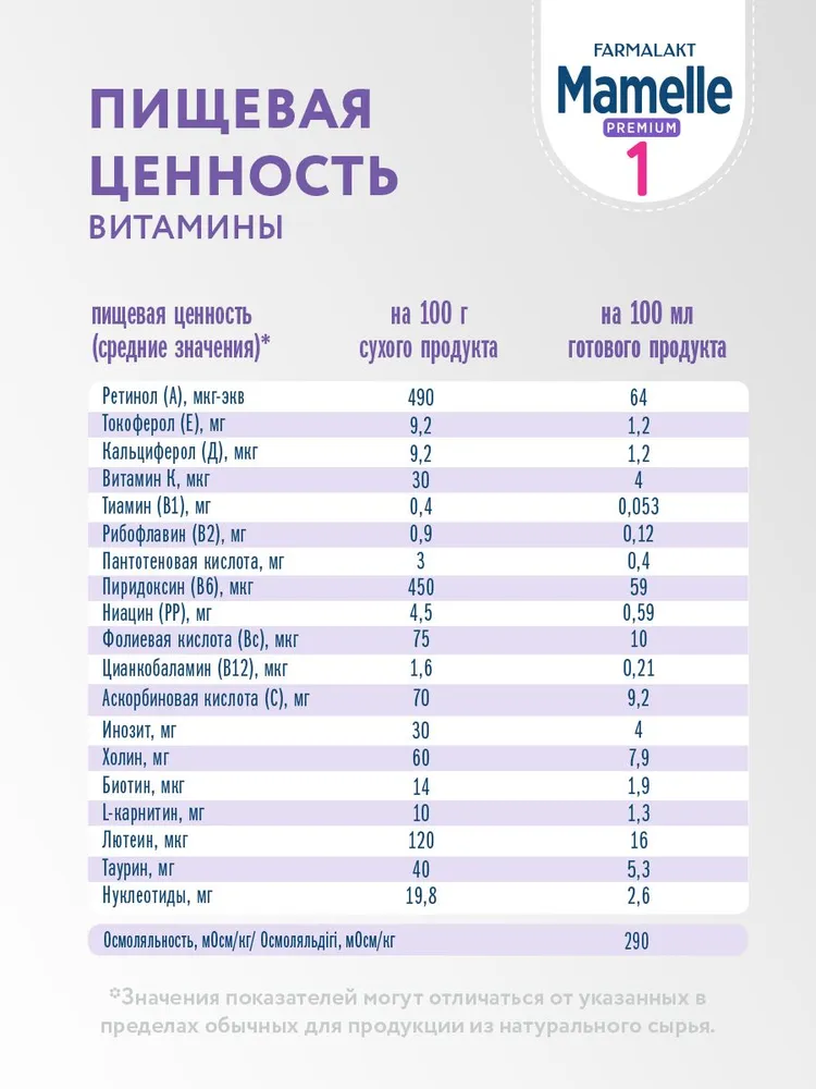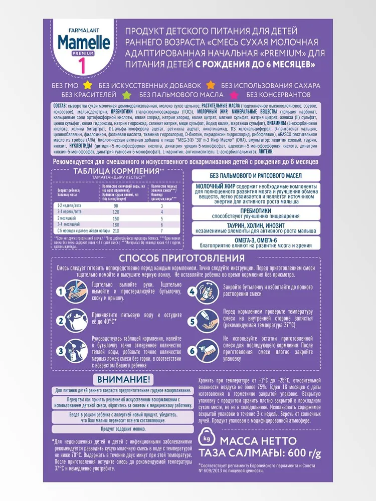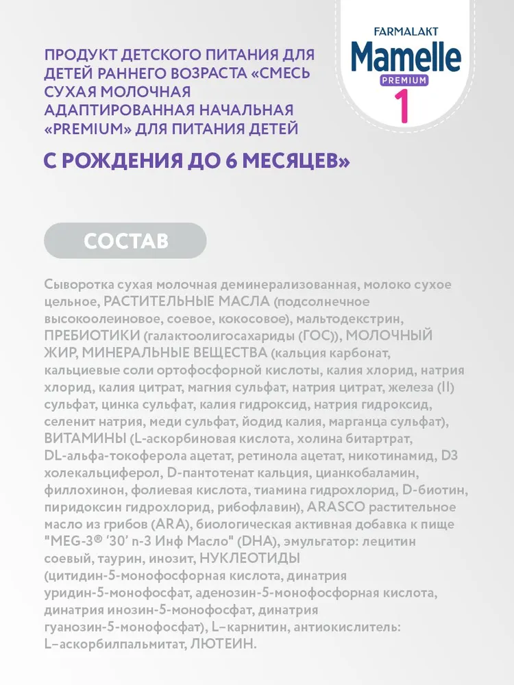 Смесь сухая молочная адаптированная начальная Mamelle Premium 1 для детей с рождения до 6 месяцев - это сбалансированный состав смеси без пальмового и рапсового масел, содержащий молочный жир, обогащенный пребиотиками, витаминами и минералами. Продукция производится на новейшем современном заводе с соблюдением передовых технологий, а также высоких требований к сырью и качеству детского питания. Отсутствие в составе пальмового и рапсового масел благоприятно влияет на развитие и крепость костной основы, снижается вероятность возникновения колик и запоров у ребенка. Молочный жир - содержит необходимые компоненты для правильного развития мозга и улучшения обмена веществ, легко усваивается и является источником энергии для активного роста малыша. Пребиотики - способствуют улучшению пищеварения растущего организма. Витамины Омега 3 и Омега 6 оказывают положительное влияние на правильное развитие мозга и зрения малыша. Состав: сыворотка сухая молочная деминерализованная, молоко сухое цельное, РАСТИТЕЛЬНЫЕ МАСЛА (подсолнечное высокоолеиновое, соевое, кокосовое), мальтодекстрин, ПРЕБИОТИКИ (галактоолигосахариды (ГОС)), МОЛОЧНЫЙ ЖИР, МИНЕРАЛЬНЫЕ ВЕЩЕСТВА (кальция карбонат, кальциевые соли ортофосфорной кислоты, калия хлорид, натрия хлорид, калия цитрат, магния сульфат, натрия цитрат, железа (II) сульфат, цинка сульфат, калия гидроксид, натрия гидроксид, селенит натрия, меди сульфат, йодид калия, марганца сульфат), ВИТАМИНЫ (L-аскорбиновая кислота, холина битартрат, DL-альфа-токоферола ацетат, ретинола ацетат, никотинамид, D3 холекальциферол, D-пантотенат кальция, цианкобаламин, филлохинон, фолиевая кислота, тиамина гидрохлорид, D-биотин, пиридоксин гидрохлорид, рибофлавин), биологическая активная добавка к пище "MEG-3® ‘30’ n-3 Инф Масло" (DHA), ARACSO растительное масло из грибов (ARA), эмульгатор: ЛЕЦИТИН СОЕВЫЙ, таурин, инозит, НУКЛЕОТИДЫ (цитидин-5-монофосфорная кислота, динатрия уридин-5-монофосфат, аденозин-5-монофосфорная кислота, динатрия инозин-5-монофосфат, динатрия гуанозин-5-монофосфат), L–карнитин, антиокислитель: L–аскорбилпальмитат, ЛЮТЕИН. Для питания детей раннего возраста предпочтительнее грудное вскармливание. Перед тем как принять решение об искусственном вскармливании с использованием детской смеси, обратитесь за советом к медицинскому работнику Способ приготовления: - тщательно вымойте руки; - тщательно вымойте и простерилизуйте бутылочку, соску и крышку; - прокипятите питьевую воду и остудить её до 40°С; - руководствуясь таблицей кормления (расположена на упаковке), налейте в бутылочку точно отмеренное количество теплой воды, добавьте точное количество мерных ложек смеси без горки, в соответствии с возрастом Вашего ребенка; - закройте бутылочку и взболтайте до полного растворения смеси; - проверьте температуры смеси на внутренней стороне запястья, температура должна быть 37°С; - не использовать остатки приготовленной смеси для последующего кормления; - после приготовления смеси плотно закрыть упаковку. Продукт следует готовить непосредственно перед каждым кормлением. Точно следуйте инструкции, расположенной на упаковке. Не оставляйте ребенка во время кормления без присмотра! Упаковка: герметичный пакет 350 грамм, мерная ложечка (внутри). Условия хранения: хранить при температуре от 1 до 25 °С, относительной влажности не более 75