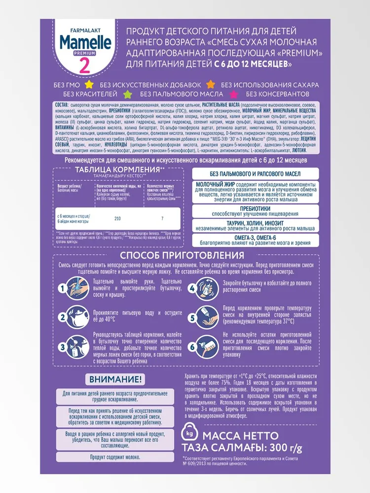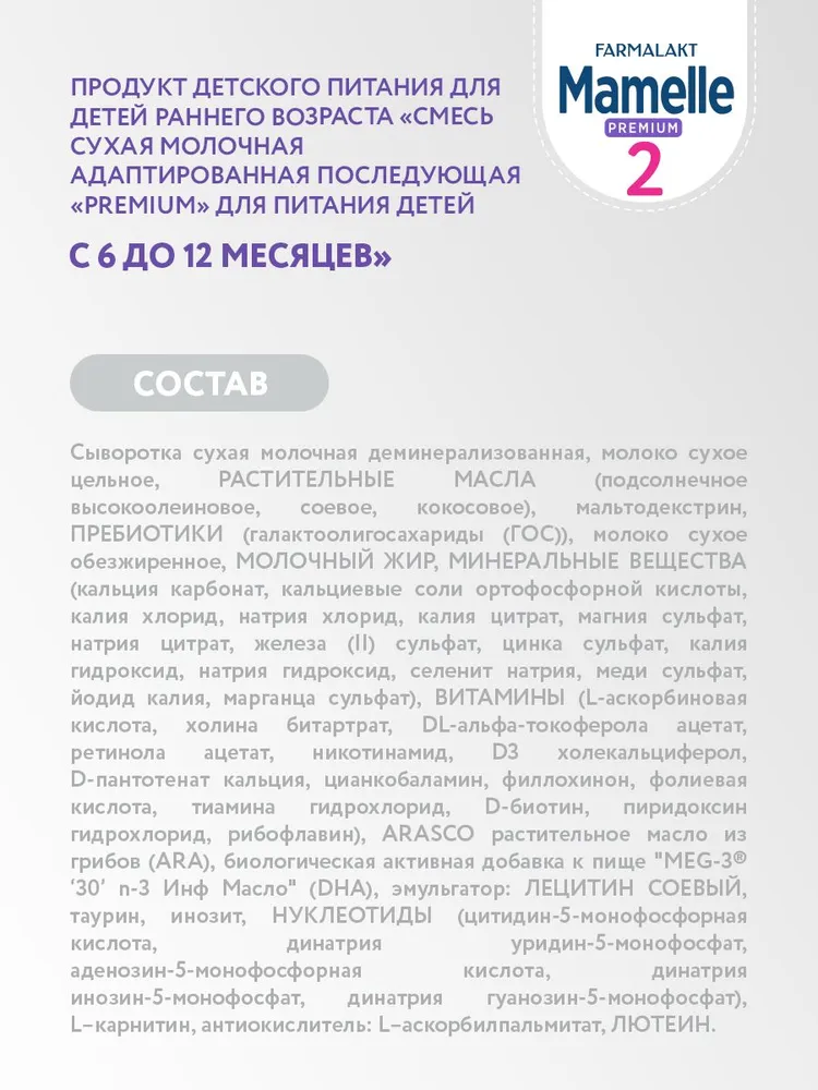 Смесь сухая молочная адаптированная последующая Mamelle Premium 2 для детей с 6 до 12 месяцев - это сбалансированный состав смеси без пальмового и рапсового масел, содержащий молочный жир, обогащенный пребиотиками, витаминами и минералами. Продукция производится на новейшем современном заводе с соблюдением передовых технологий, а также высоких требований к сырью и качеству детского питания. Отсутствие в составе пальмового и рапсового масел благоприятно влияет на развитие и крепость костной основы, снижается вероятность возникновения колик и запоров у ребенка. Молочный жир - содержит необходимые компоненты для правильного развития мозга и улучшения обмена веществ, легко усваивается и является источником энергии для активного роста малыша. Пребиотики - способствуют улучшению пищеварения растущего организма. Витамины Омега 3 и Омега 6 оказывают положительное влияние на правильное развитие мозга и зрения малыша. Состав: сыворотка сухая молочная деминерализованная, молоко сухое цельное, РАСТИТЕЛЬНЫЕ МАСЛА (подсолнечное высокоолеиновое, соевое, кокосовое), мальтодекстрин, ПРЕБИОТИКИ (галактоолигосахариды (ГОС)), молоко сухое обезжиренное, МОЛОЧНЫЙ ЖИР, МИНЕРАЛЬНЫЕ ВЕЩЕСТВА (кальция карбонат, кальциевые соли ортофосфорной кислоты, калия хлорид, натрия хлорид, калия цитрат, магния сульфат, натрия цитрат, железа (II) сульфат, цинка сульфат, калия гидроксид, натрия гидроксид, селенит натрия, меди сульфат, йодид калия, марганца сульфат), ВИТАМИНЫ (L-аскорбиновая кислота, холина битартрат, DL-альфа-токоферола ацетат, ретинола ацетат, никотинамид, D3 холекальциферол, D-пантотенат кальция, цианкобаламин, филлохинон, фолиевая кислота, тиамина гидрохлорид, D-биотин, пиридоксин гидрохлорид, рибофлавин), биологическая активная добавка к пище "MEG-3® ‘30’ n-3 Инф Масло" (DHA), ARACSO растительное масло из грибов (ARA), эмульгатор: ЛЕЦИТИН СОЕВЫЙ, таурин, инозит, НУКЛЕОТИДЫ (цитидин-5-монофосфорная кислота, динатрия уридин-5-монофосфат, аденозин-5-монофосфорная кислота, динатрия инозин-5-монофосфат, динатрия гуанозин-5-монофосфат), L–карнитин, антиокислитель: L–аскорбилпальмитат, ЛЮТЕИН. Для питания детей раннего возраста предпочтительнее грудное вскармливание. Перед тем как принять решение об искусственном вскармливании с использованием детской смеси, обратитесь за советом к медицинскому работнику Способ приготовления: - тщательно вымойте руки; - тщательно вымойте и простерилизуйте бутылочку, соску и крышку; - прокипятите питьевую воду и остудить её до 40°С; - руководствуясь таблицей кормления (расположена на упаковке), налейте в бутылочку точно отмеренное количество теплой воды, добавьте точное количество мерных ложек смеси без горки, в соответствии с возрастом Вашего ребенка; - закройте бутылочку и взболтайте до полного растворения смеси; - проверьте температуры смеси на внутренней стороне запястья, температура должна быть 37°С; - не использовать остатки приготовленной смеси для последующего кормления; - после приготовления смеси плотно закрыть упаковку. Продукт следует готовить непосредственно перед каждым кормлением. Точно следуйте инструкции, расположенной на упаковке. Не оставляйте ребенка во время кормления без присмотра! Упаковка: герметичный пакет 350 грамм, мерная ложечка (внутри). Условия хранения: хранить при температуре от 1 до 25 °С, относительно