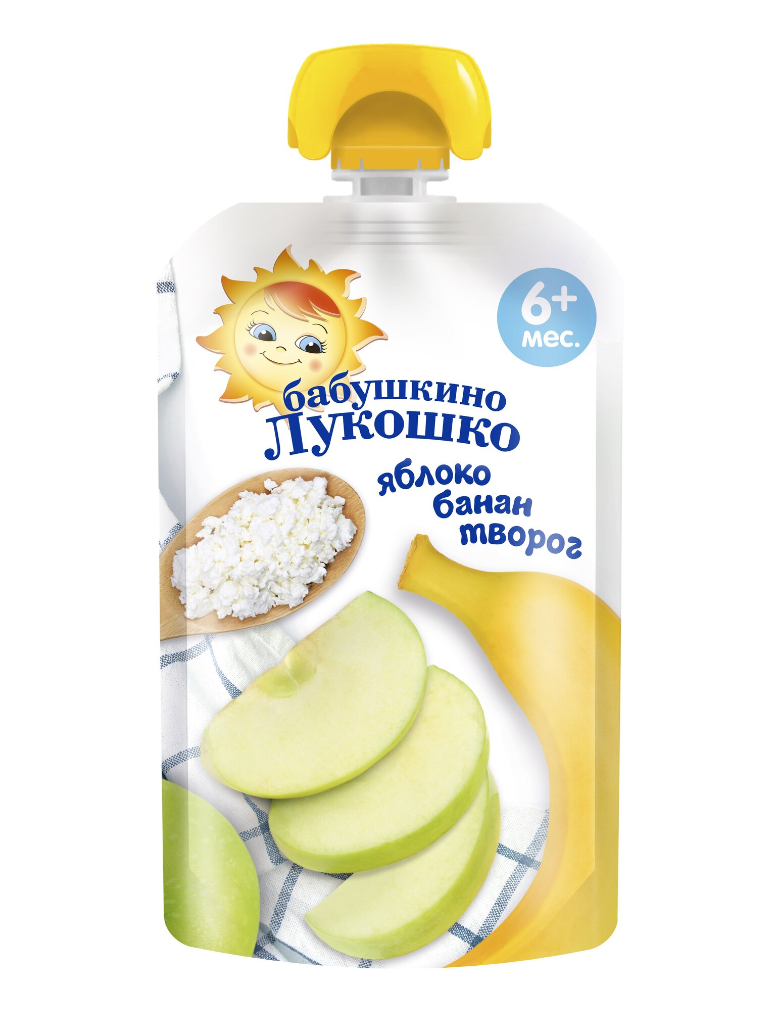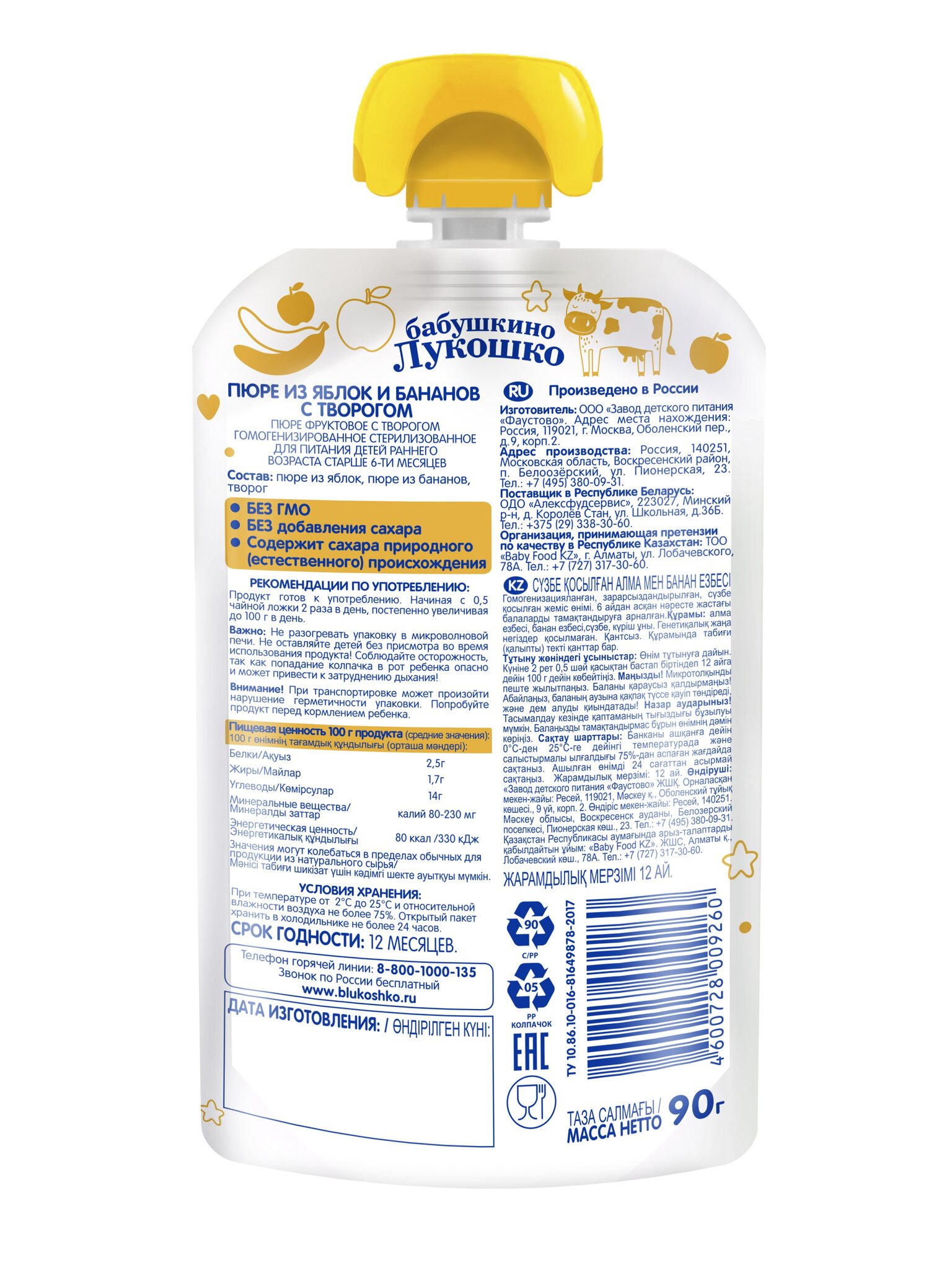 Состав: пюре из яблок и бананов, творог, мука рисовая.
