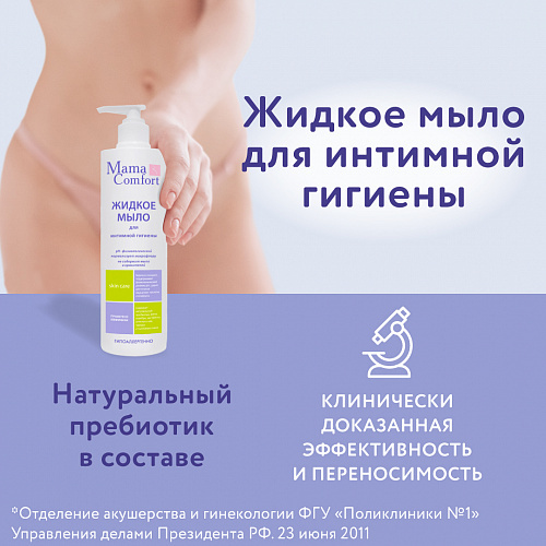 Жидкое мыло для интимной гигиены серии "Mama Com.fort" - специальное средство для ухода за деликатными участками тела в период беременности и после родов. Благодаря натуральным активным компонентам, входящим в его состав, обеспечивает мягкое очищение, снимает сухость и раздражение слизистой, придает чувство комфорта, чистоты и свежести. При регулярном использовании жидкого мыла для интимной гигиены поддерживается физиологический уровень pH интимной зоны, устраняется ощущение дискомфорта. Жидкое мыло гипоаллергенно, содержит натуральный пребиотик, ионы серебра, экстракты зеленого чая, череды и тысячелистника.